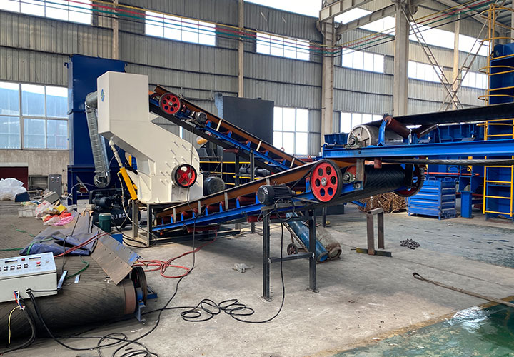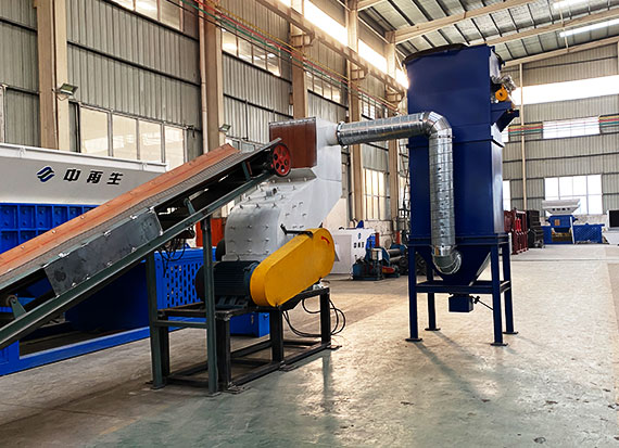 The main body shell of the crushing line is made of extra thick steel plate, with high manganese cast steel lining that can be replaced; The host rotor disk is installed on a horizontal axis, with pin shafts distributed around the circumference of the rotor disk and hammer heads suspended in the axial direction; The spindle is supported by ball bearings, lubricated and cooled by circulating oil, and equipped with temperature sensors; The feeding port is equipped with a hydraulic roller feeding device, with one high and one low position, rotating in the same direction, which can flatten large loose materials and send them into the crushing chamber.